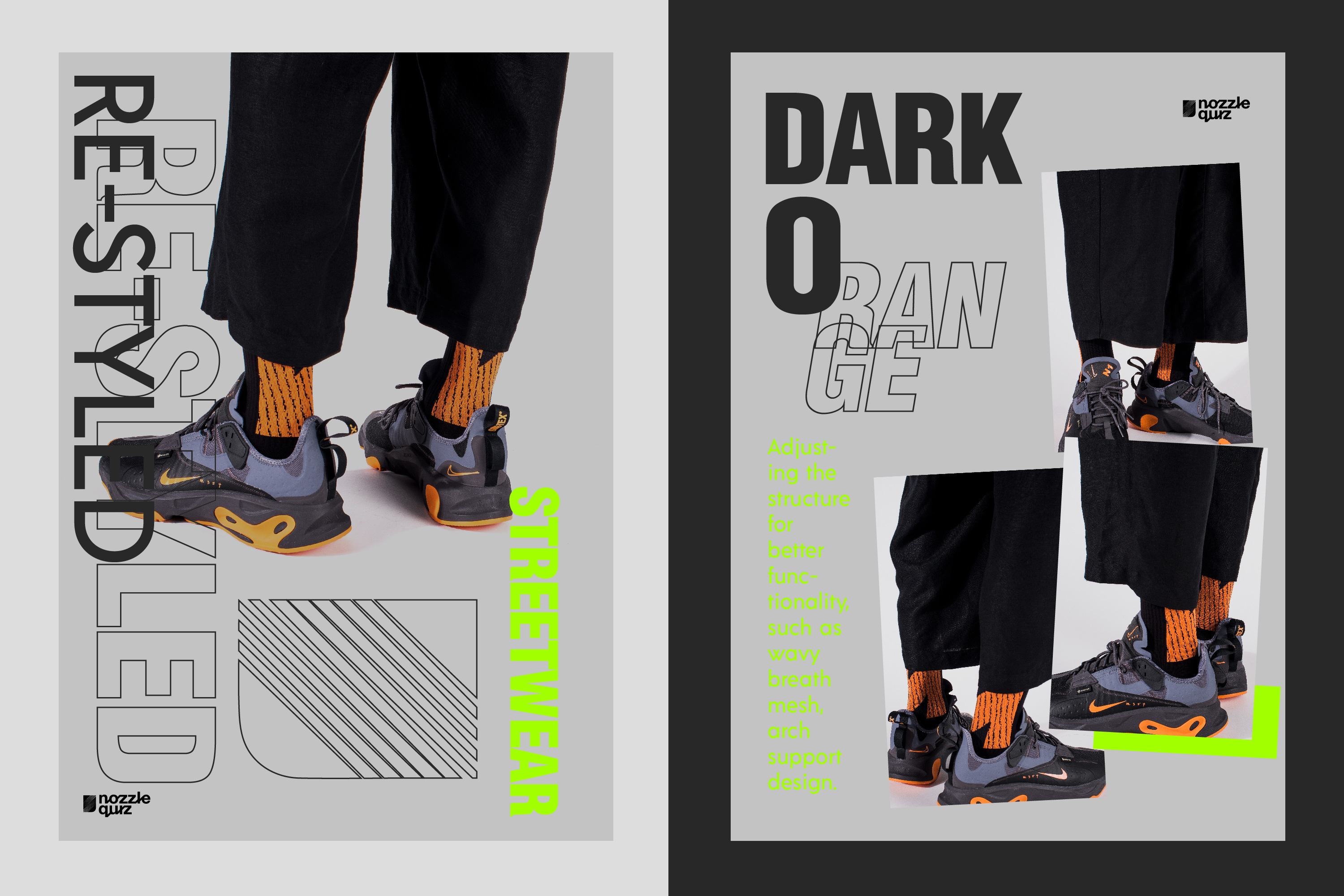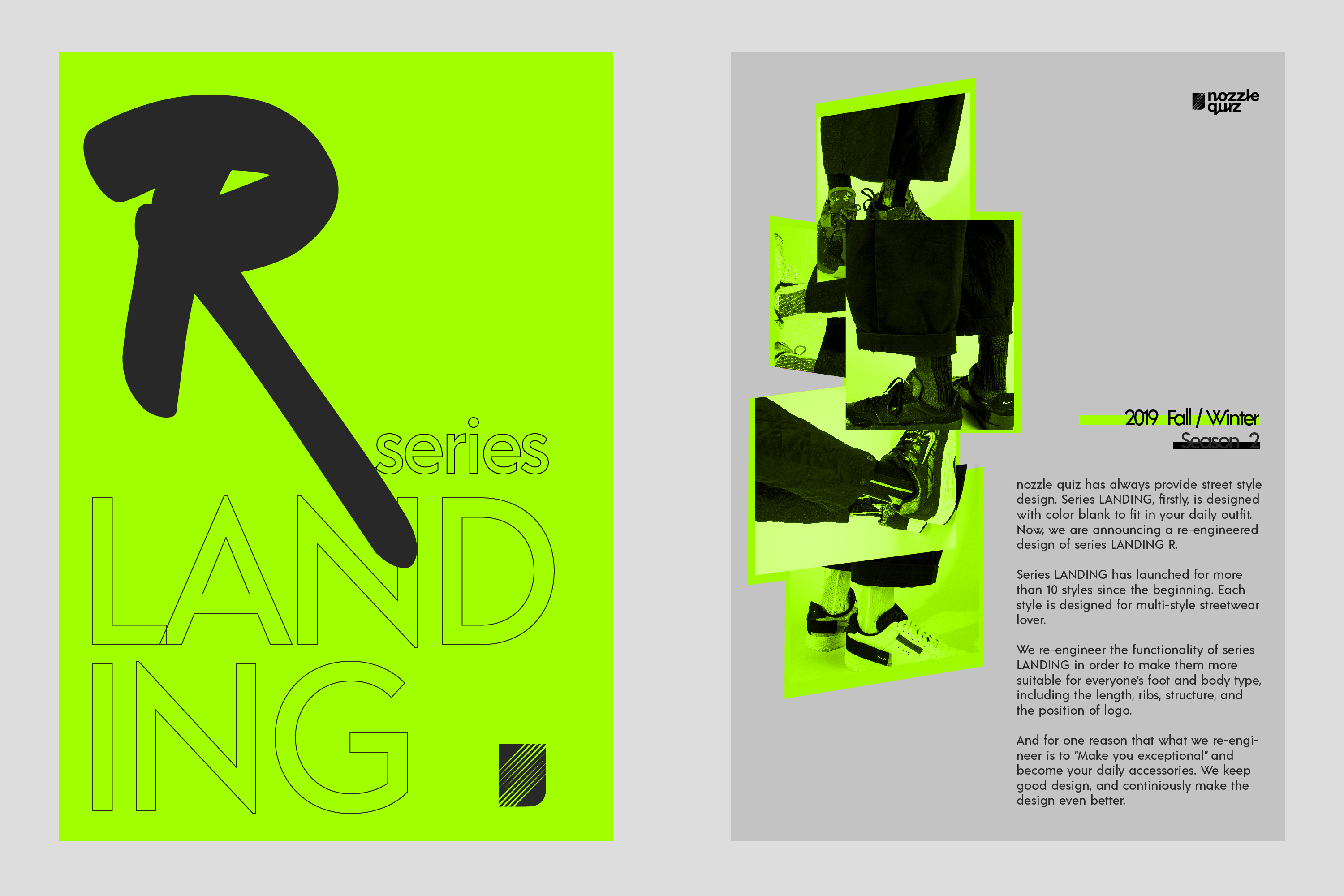 承襲 nozzle quiz 一向以來的街頭風格,LANDING 系列首當其衝以色塊鋪張整個襪身,配合與每日的搭配色彩,選用合適的襪履,今回推出重新打造的 2019 F/W - LANDING R. 系列。