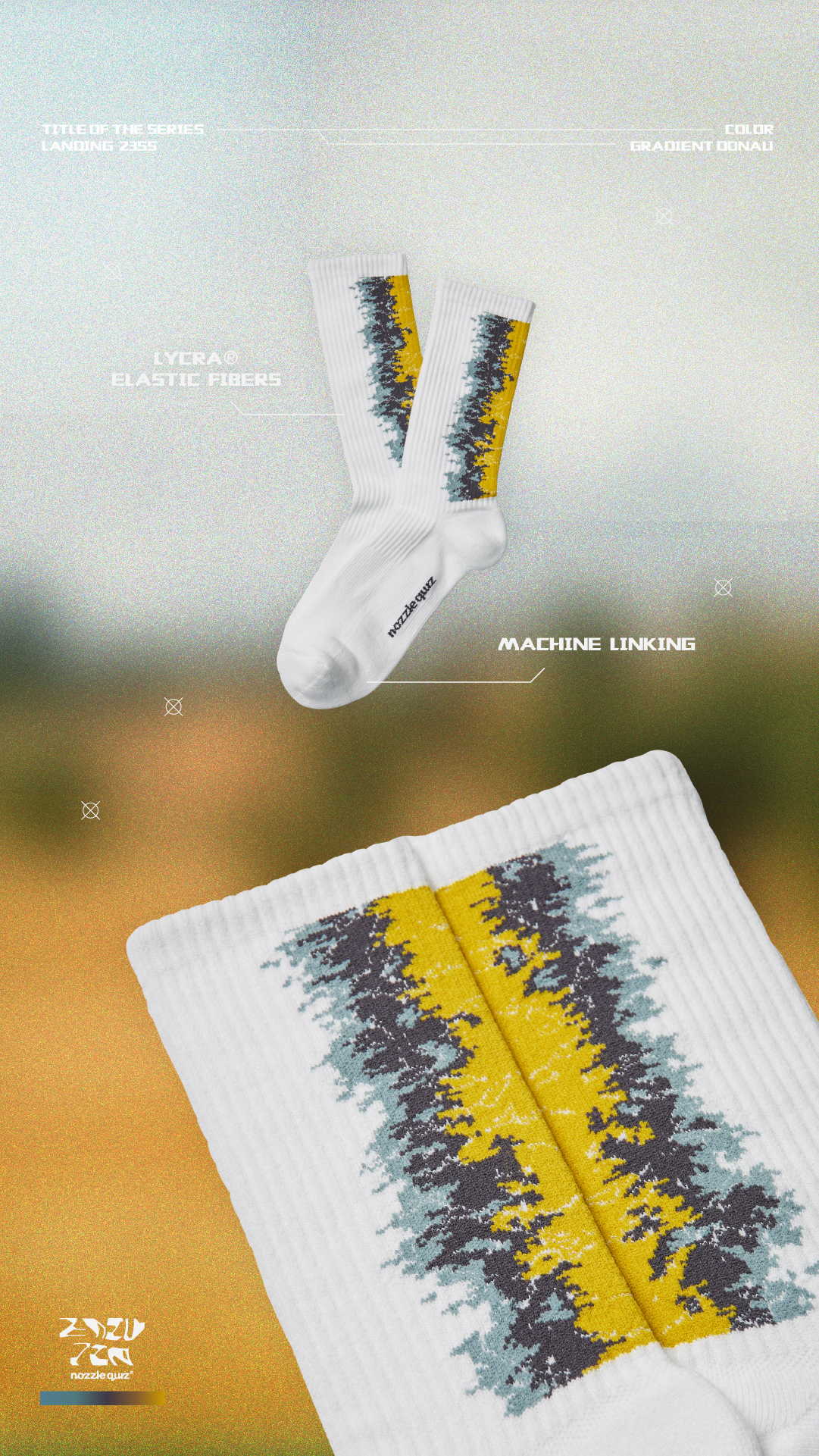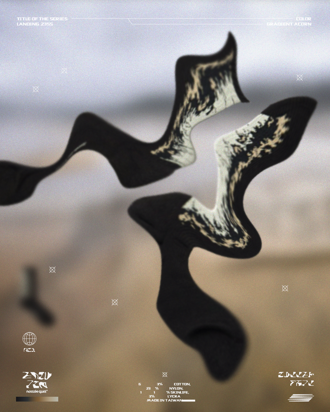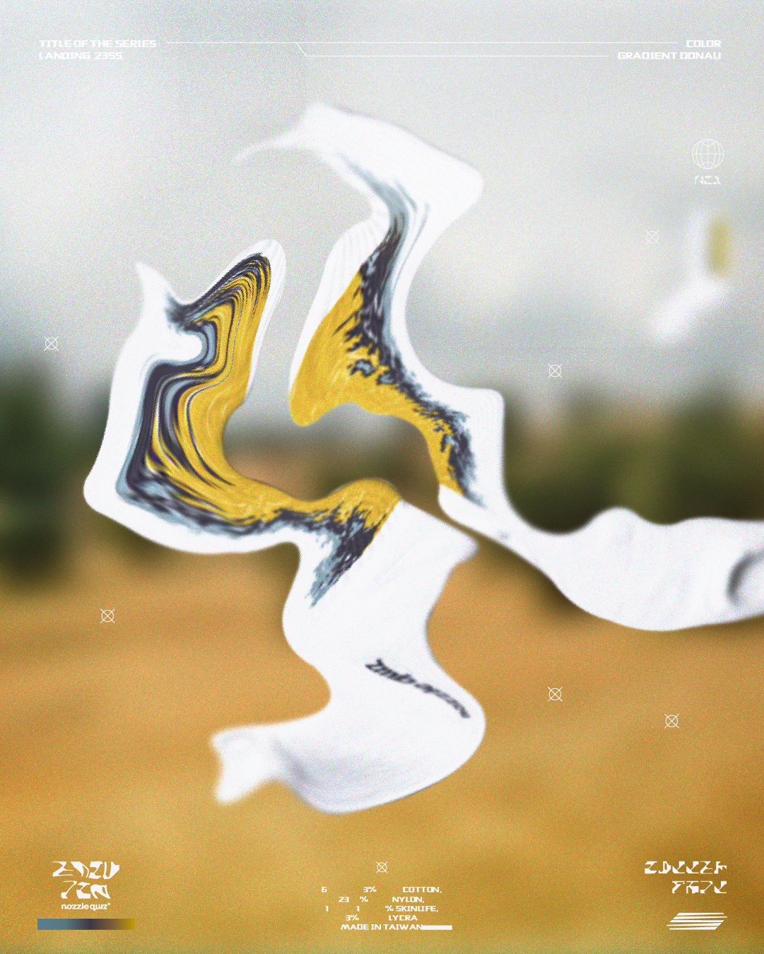 本次帶來三種地貌形象,將麥田、海岸、沙洲融入,以環境型態呼應花紋,使色彩相互交錯,並在襪口內加入隱藏標語。