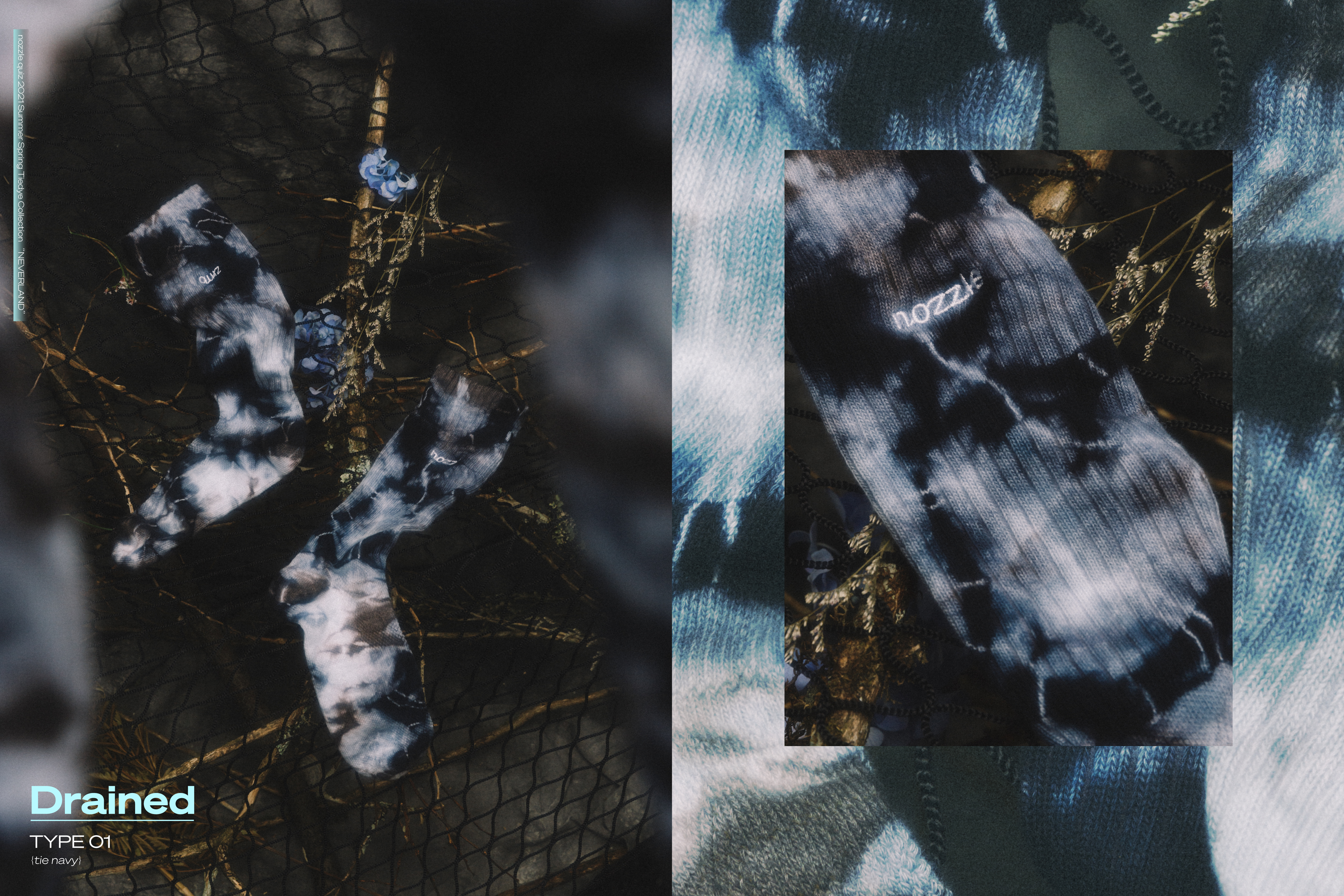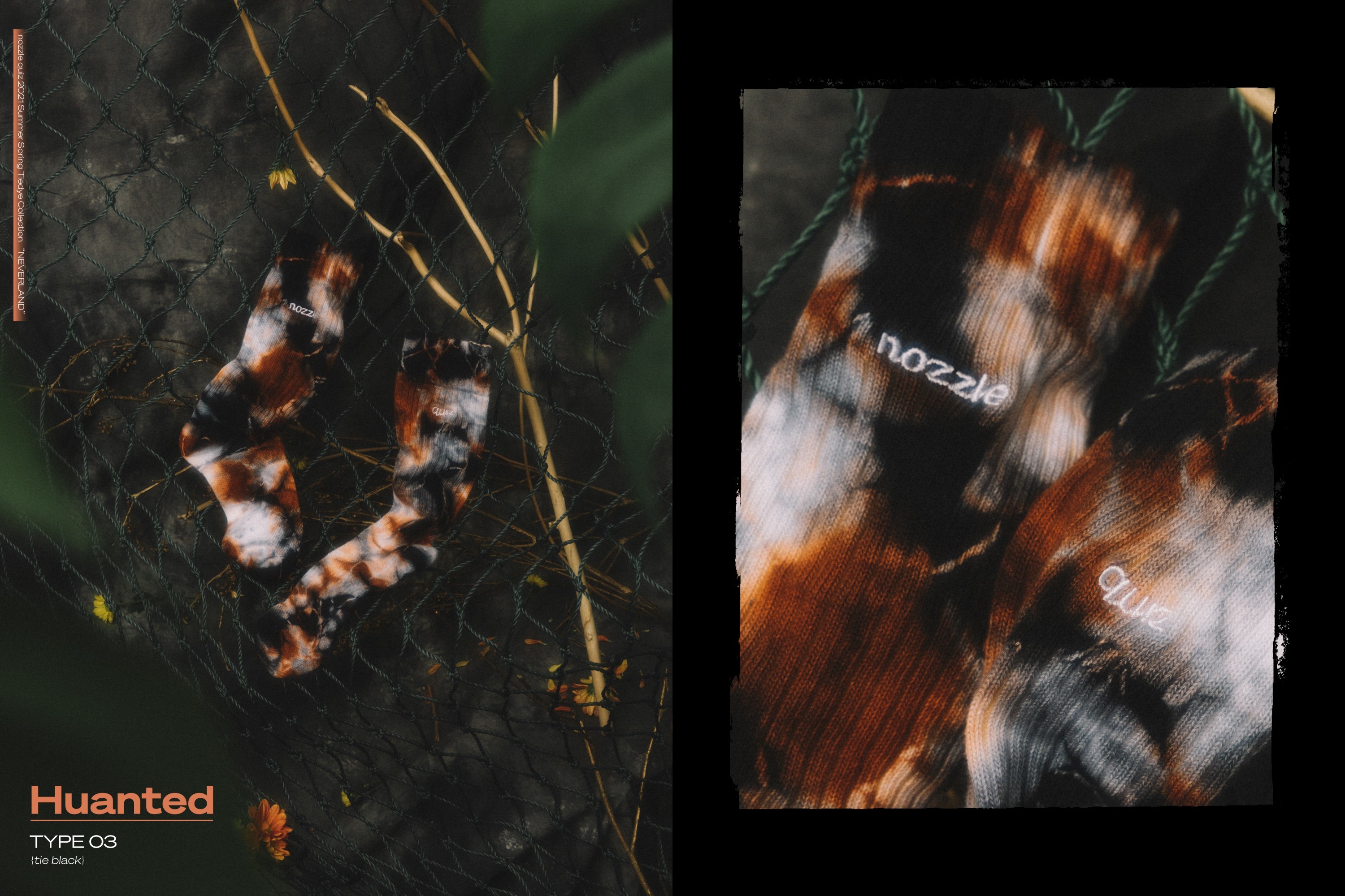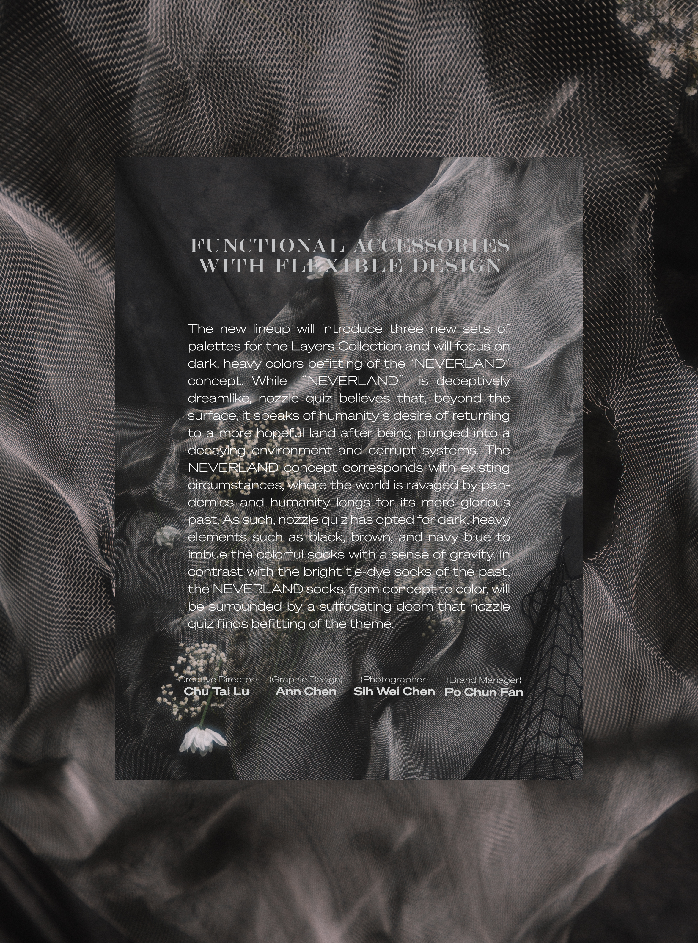 因此,本次系列中擷取更加晦暗的主題元素,採納黑色、咖啡色及藏青色等濃厚色調,將鮮豔的襪履蒙上一縷沉重風格,有別於渲染襪的鮮明印象,本次從形象到襪履配色,皆將nozzle quiz 認為的「NEVERLAND」以窒息般的氛圍表現。