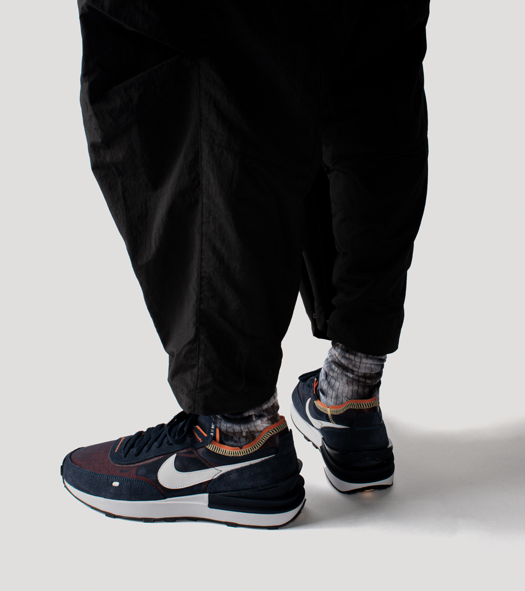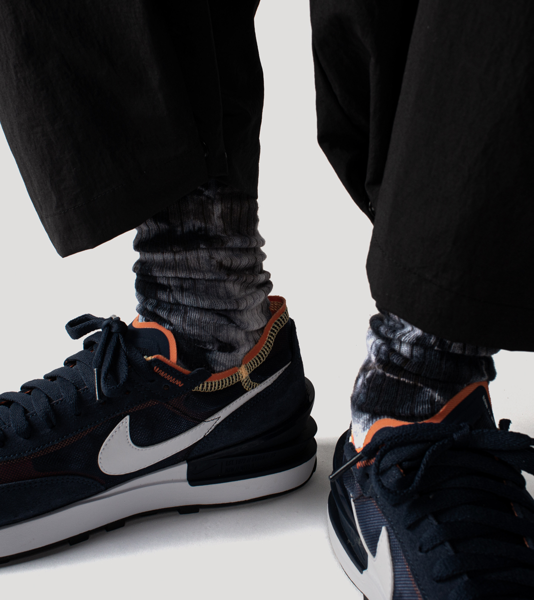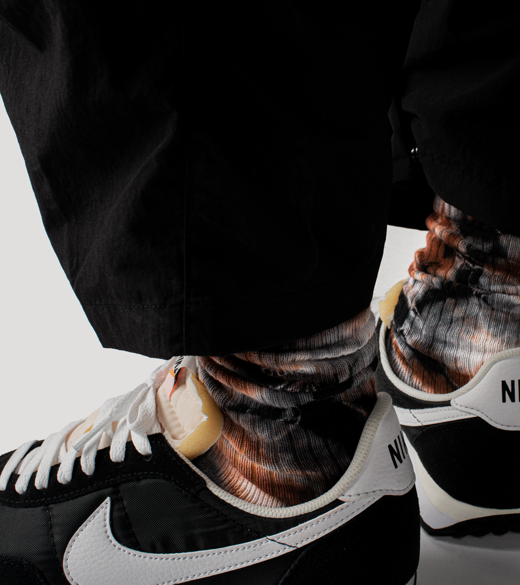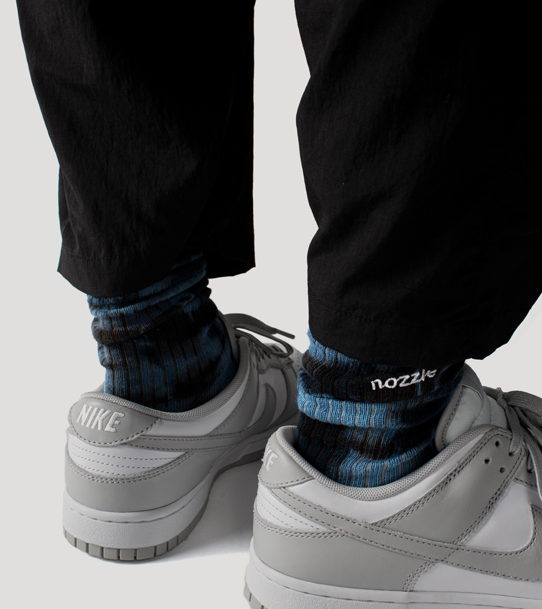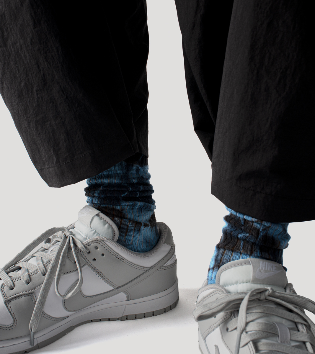 渲染部分同樣與手工染廠研議設計,採用二次綁染與套染的技法,將顏色堆疊交錯於襪身中,切合主題表現紊亂的渲染紋理。 Layers 系列為 Loose fit 鬆身輪廓,如泡泡襪般的外觀於著用時呈現隨興、自然的搭配風格。製程延續一貫使用的高品質專利材質, Skinlife® 專利銀纖維抗菌紗線、 Lycra® 專利彈性纖維加強包覆性等機能紗線,提供與城市共存所需的機能襪履。