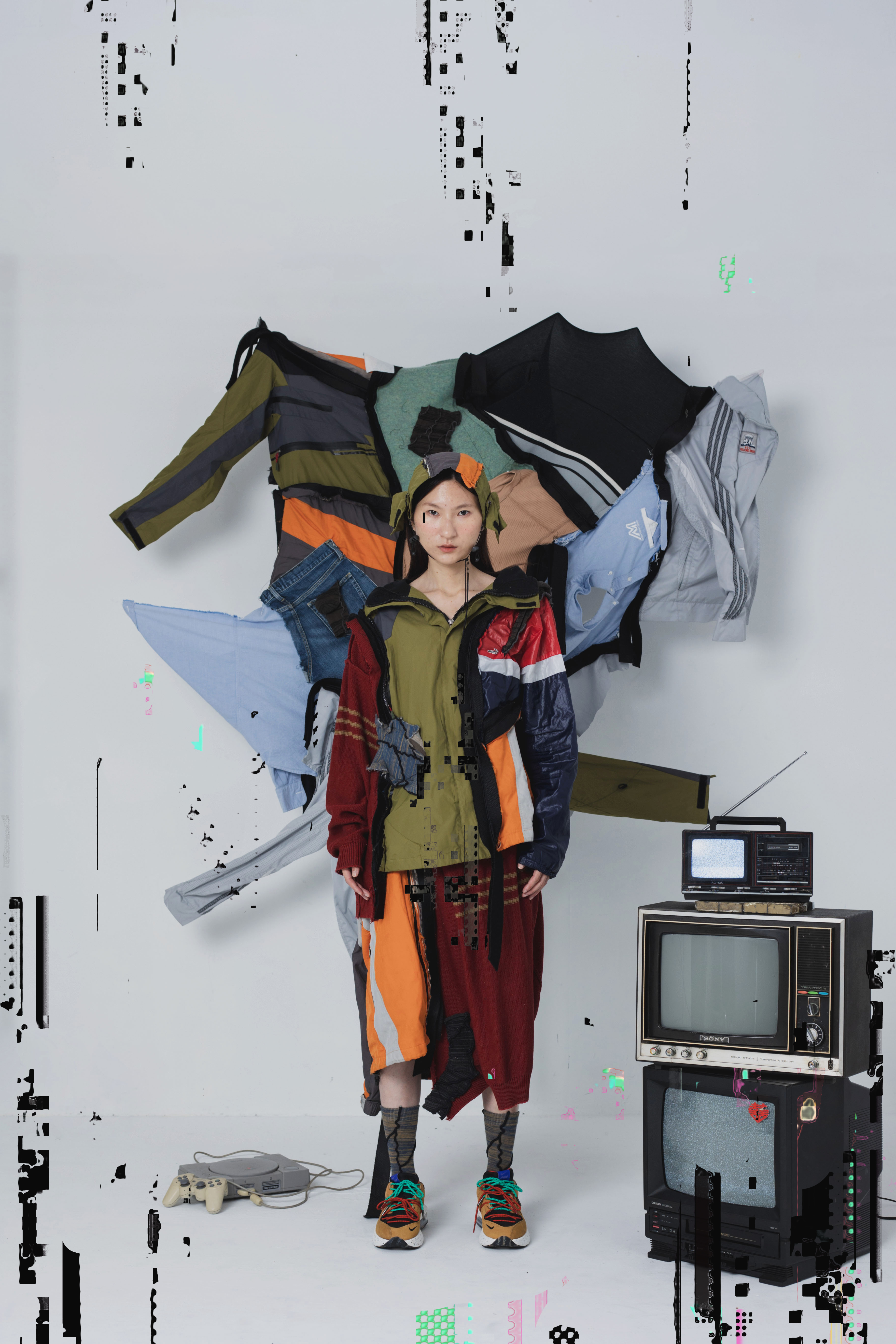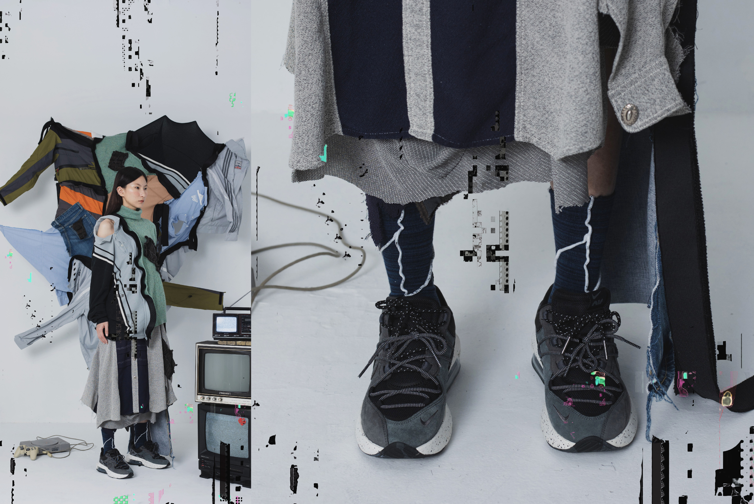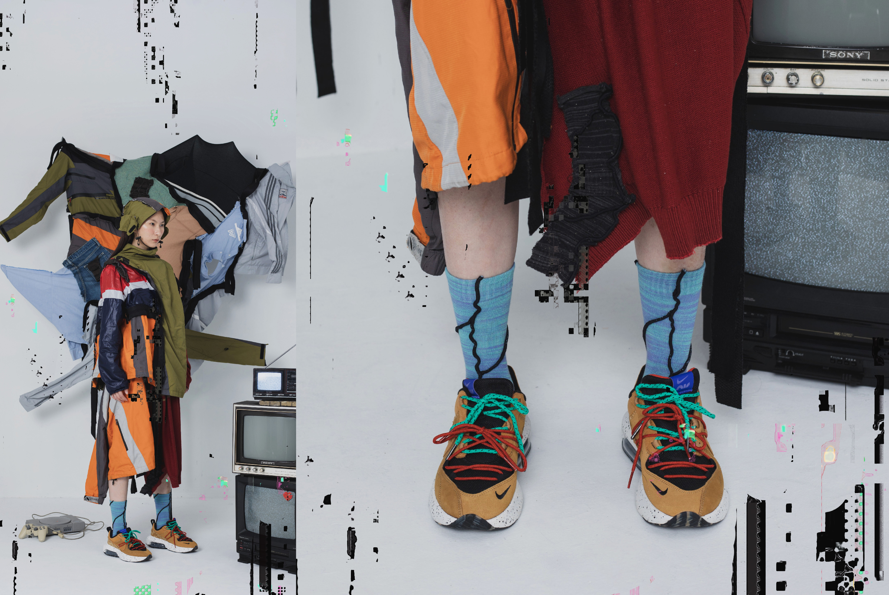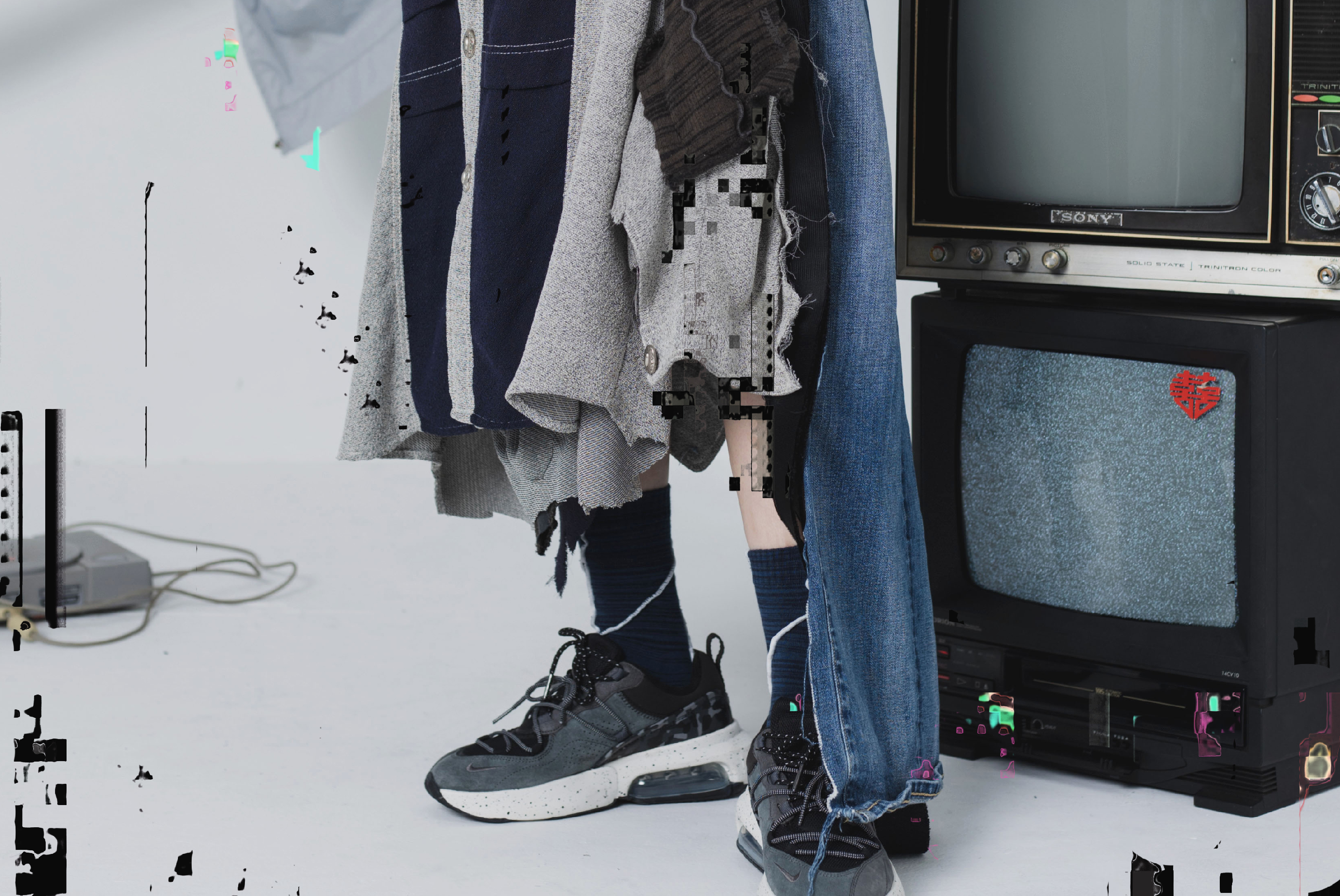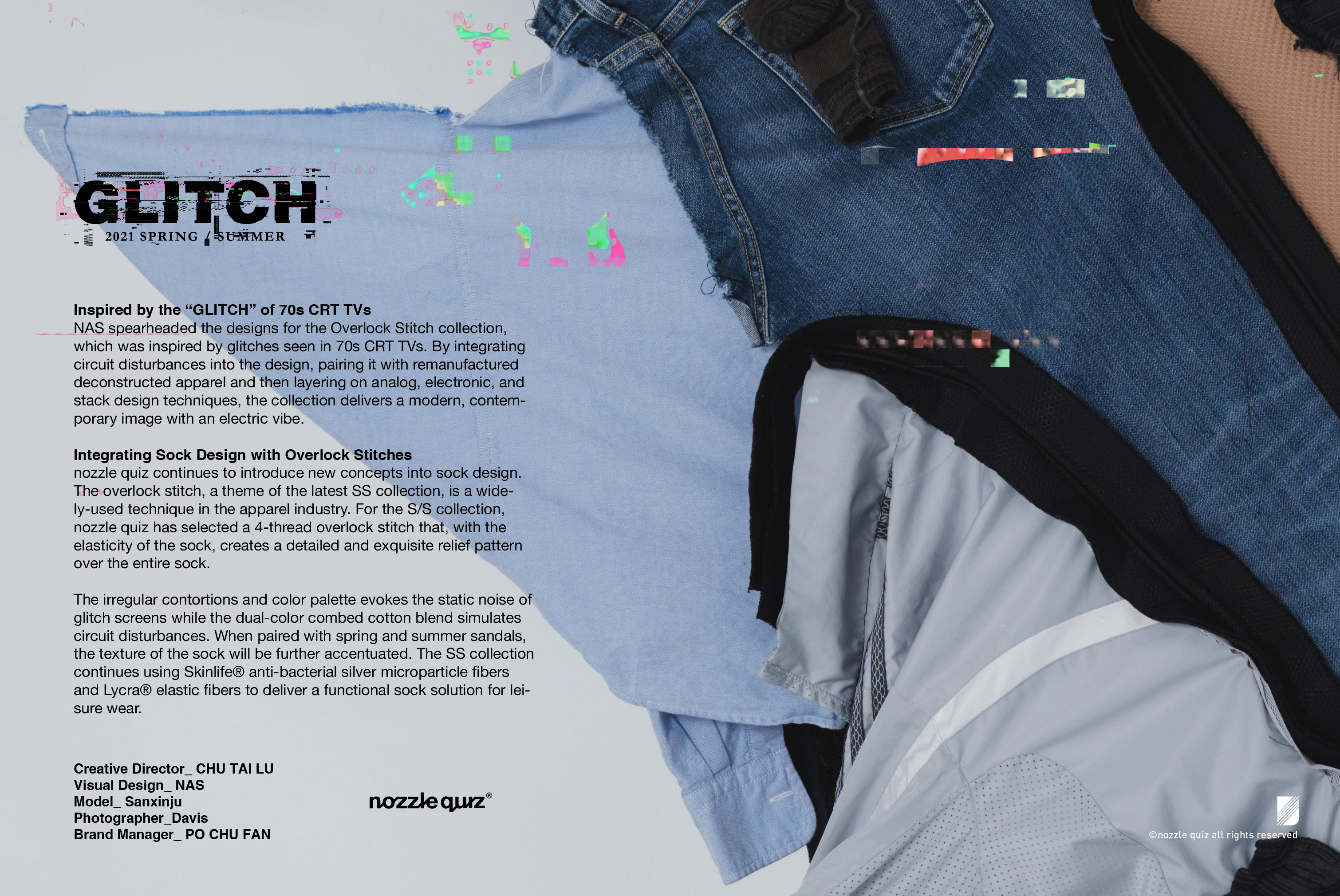 本次 Overlock Stitch 系列形象由 NAS 操刀,靈感擷取70年代映像管電視的 “GLITCH” 毛刺故障畫面,將電路擾動現象融入設計,以再製的解構服裝配上系列襪履,搭配熟稔的類比、電子、堆疊等設計手法將畫面多層疊加,營造充滿電子氛圍的摩登現代感形象。