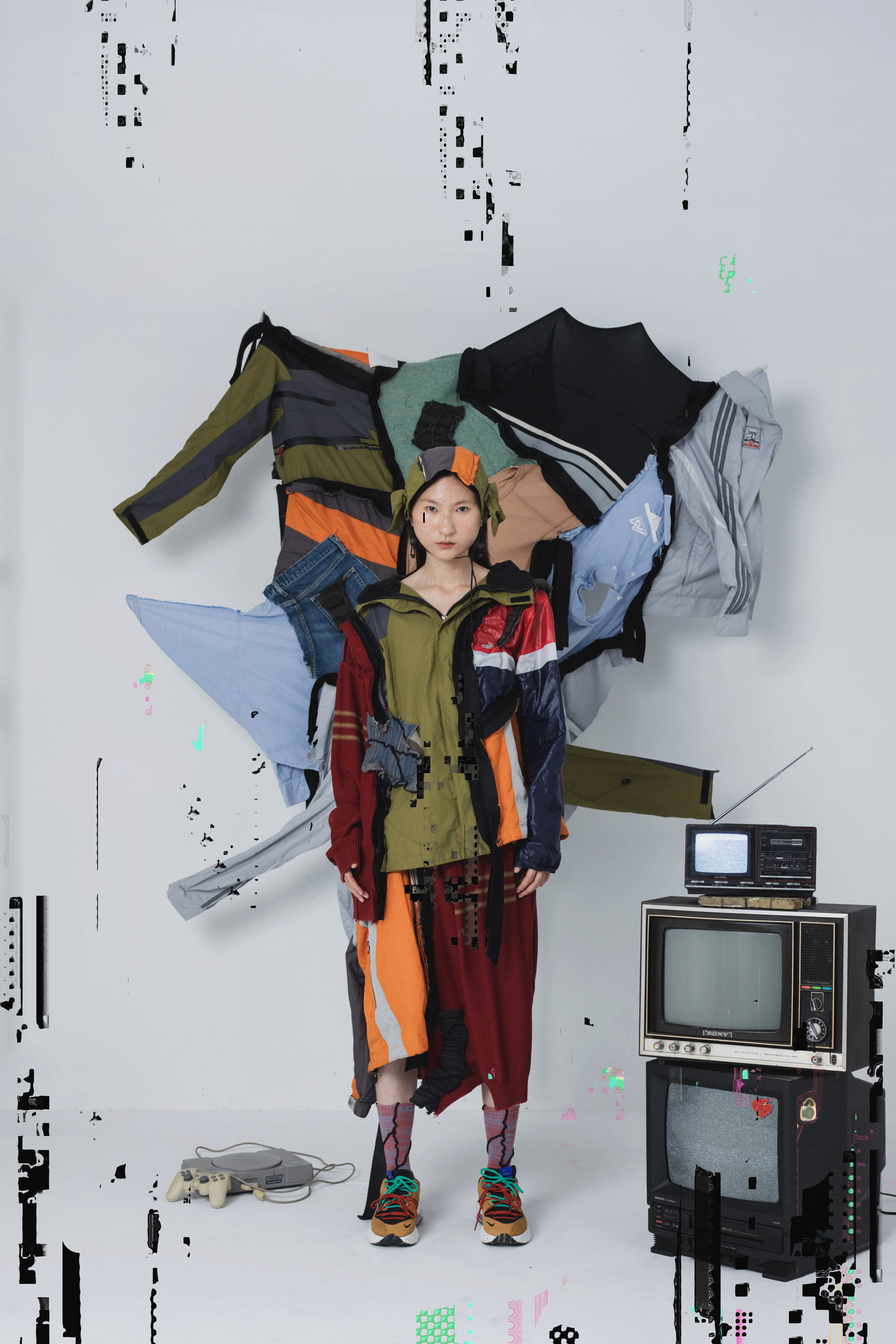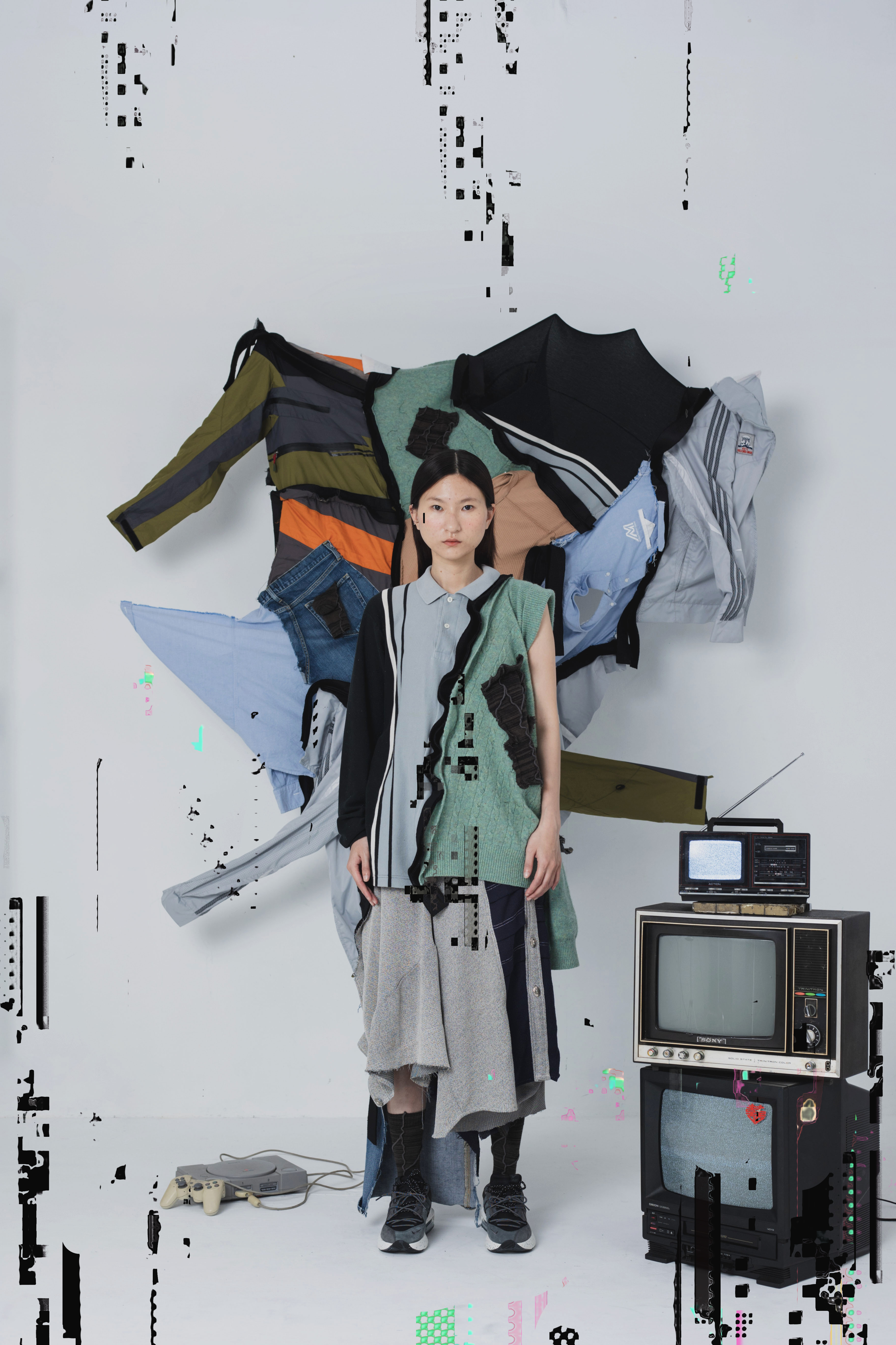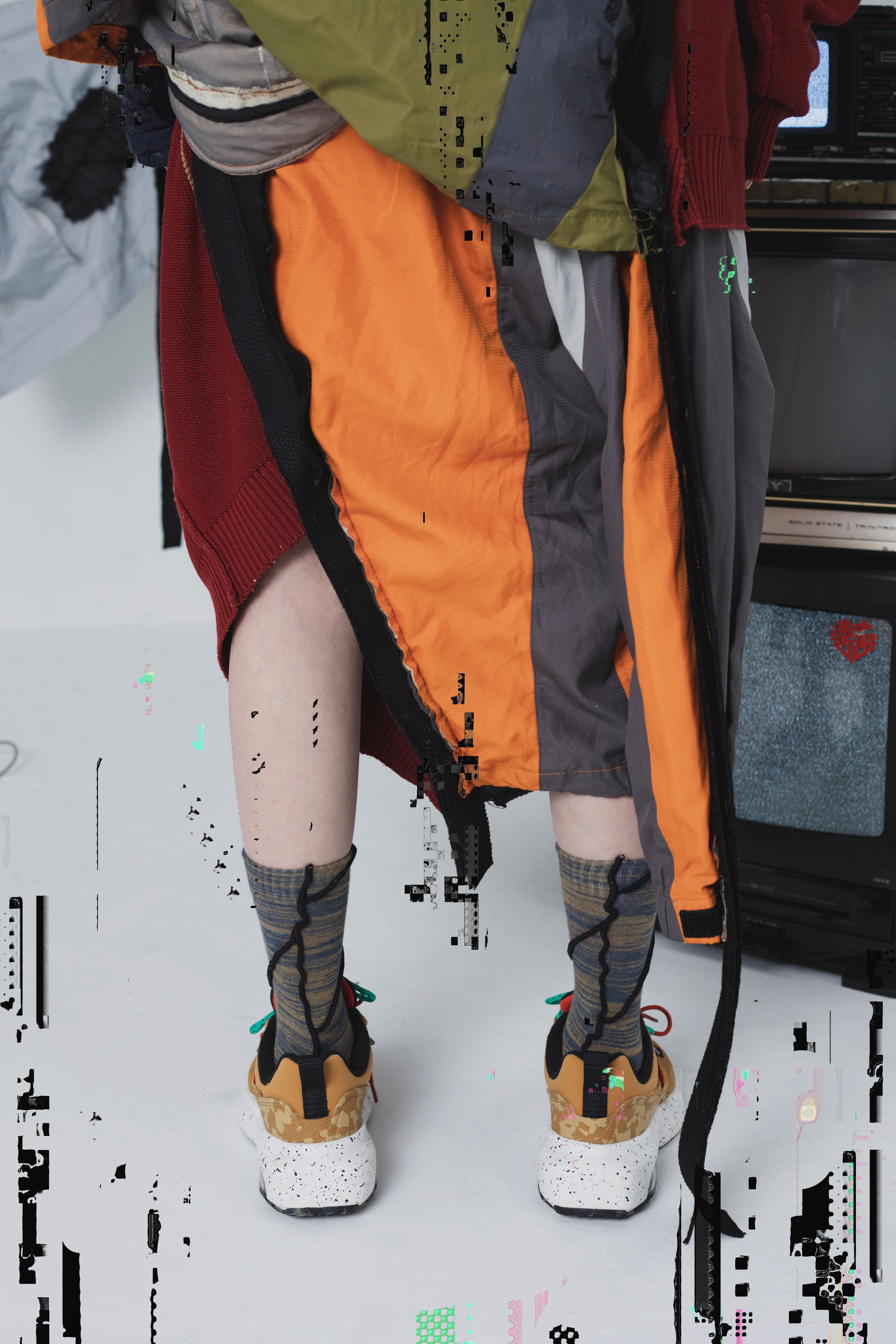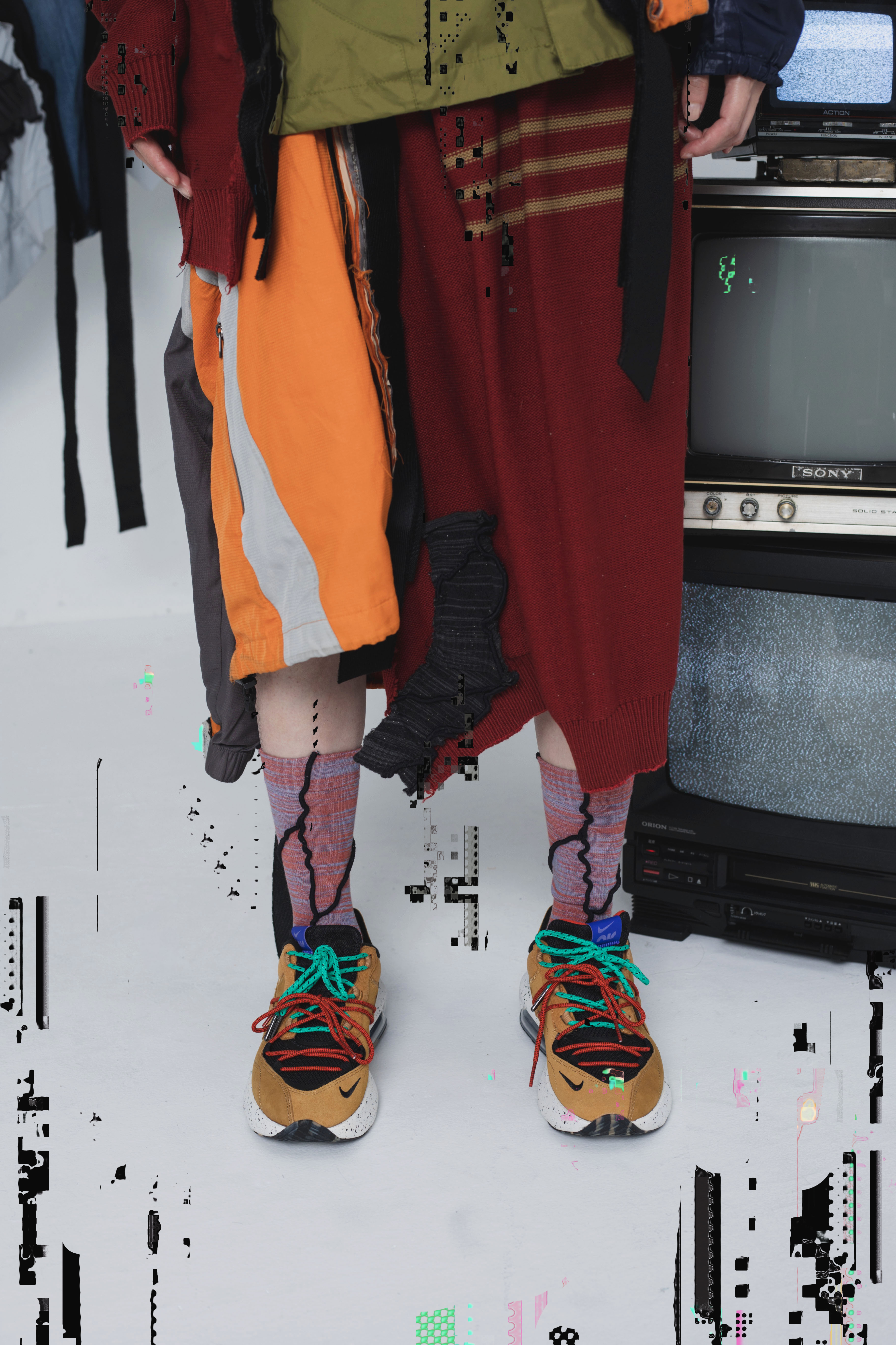 本次 Overlock Stitch 系列形象由 NAS 操刀,靈感擷取70年代映像管電視的 “GLITCH” 毛刺故障畫面,將電路擾動現象融入設計,以再製的解構服裝配上系列襪履,搭配熟稔的類比、電子、堆疊等設計手法將畫面多層疊加,營造充滿電子氛圍的摩登現代感形象。