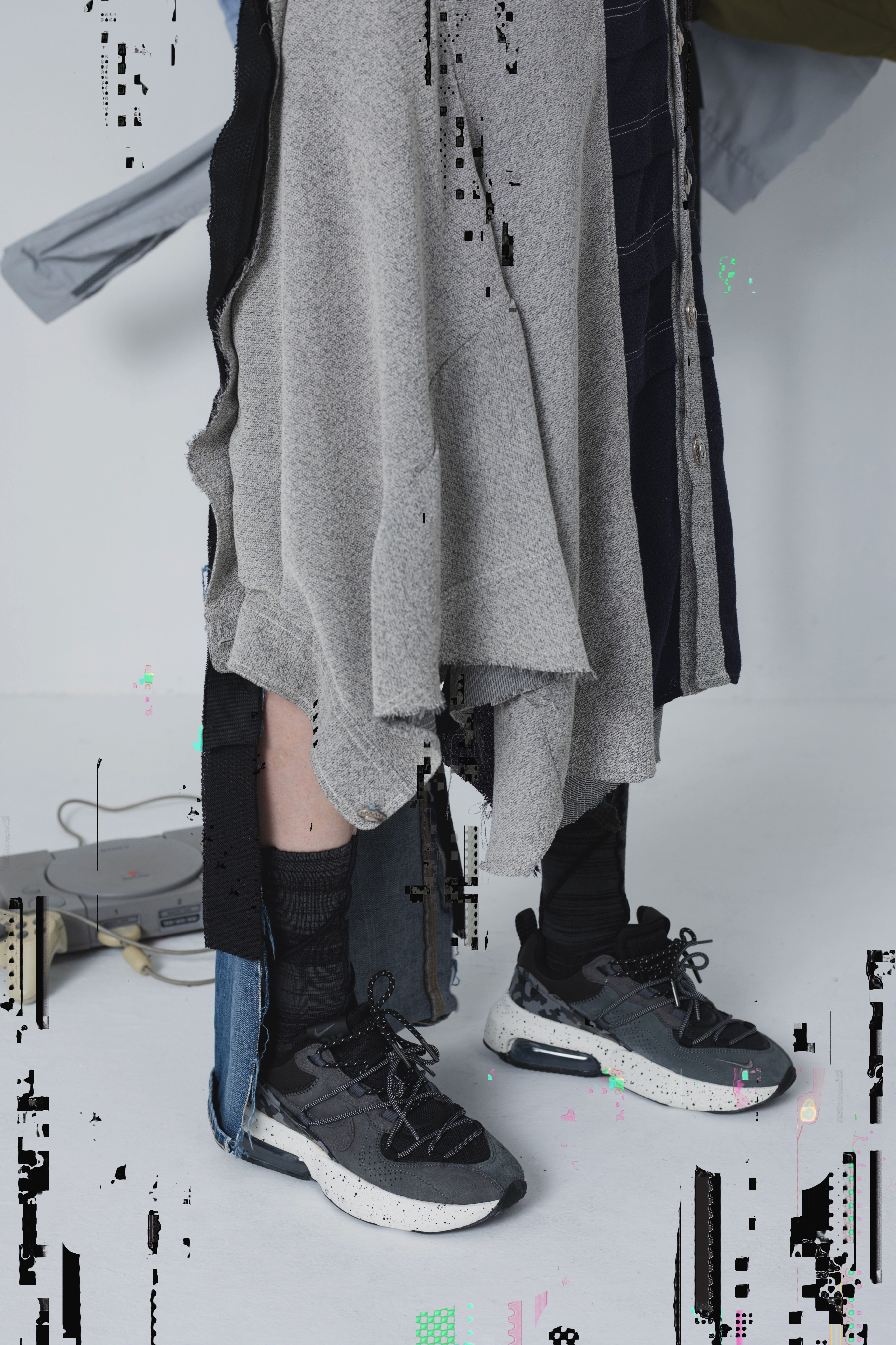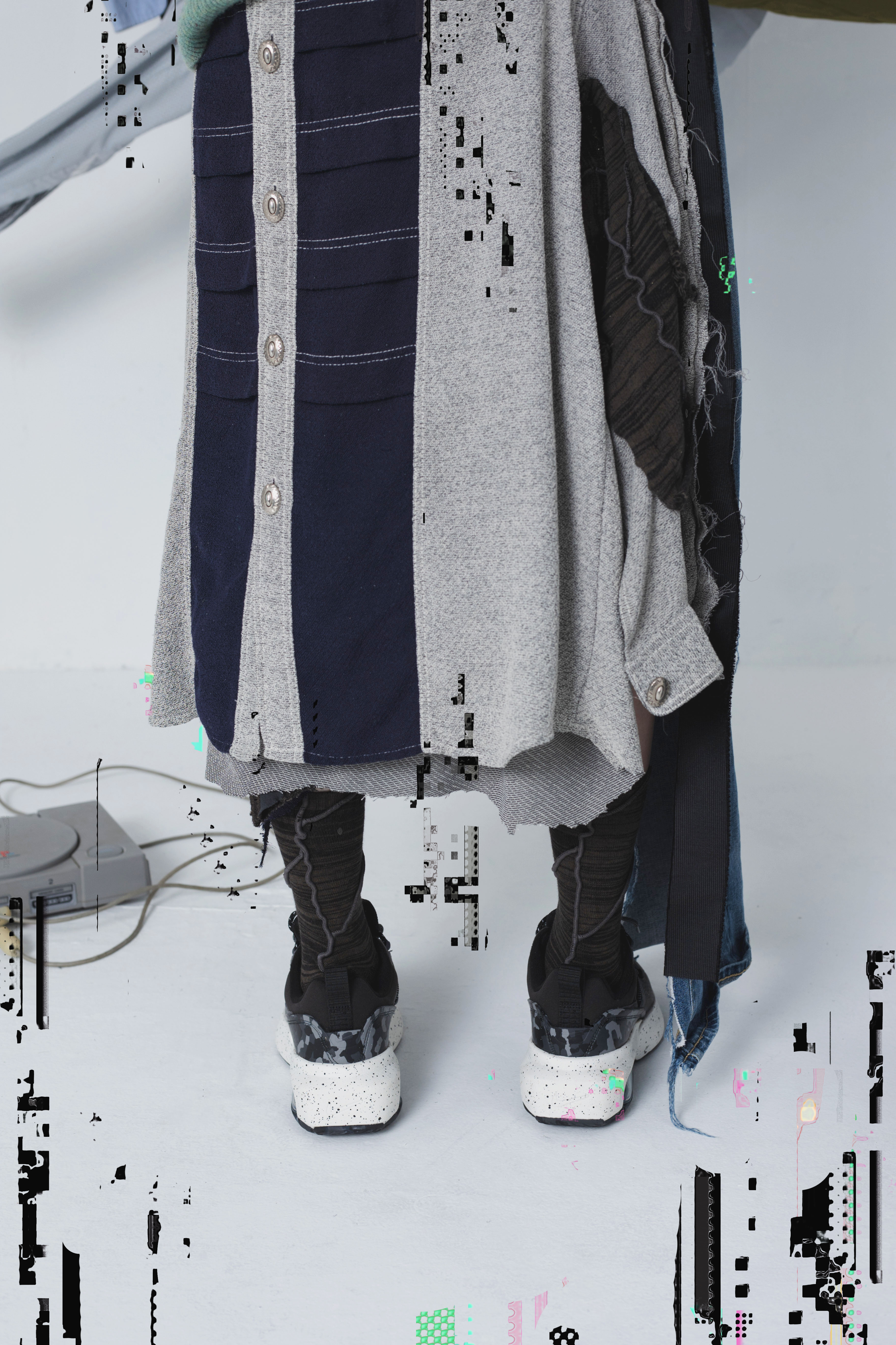 nozzle quiz 持續將新的想法融入襪履設計中,本次貫穿設計主軸的「拷克」技法,便是服裝業界慣用的工藝。此回以 4 線縫合拷克,配合襪履伸縮性產出緊密且細緻的立體紋理縱橫交錯於襪身表面,外觀以不規則的扭曲及配色表現毛刺畫面的雜訊視覺效果,並訂製特規雙色精梳棉混合織造模擬電路擾動畫面,用於搭配春夏涼鞋款時,更能突顯襪履的紋理特色。