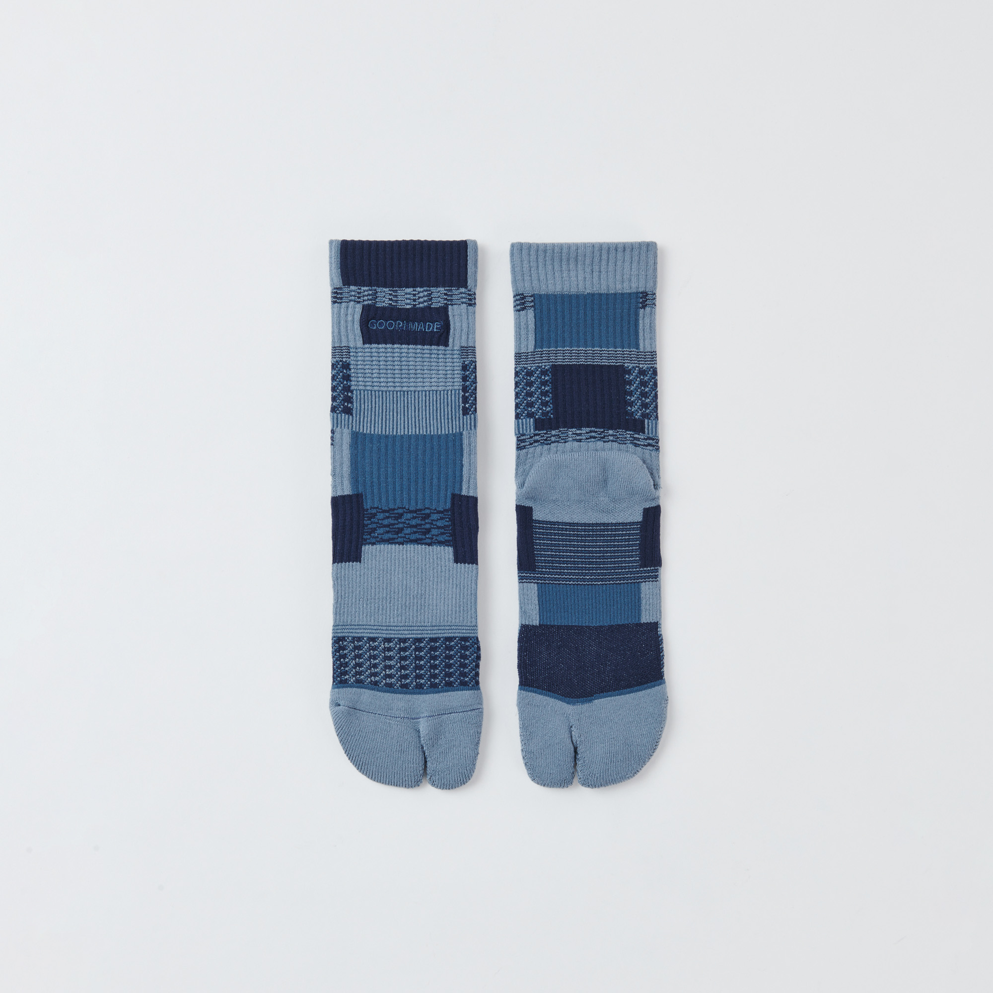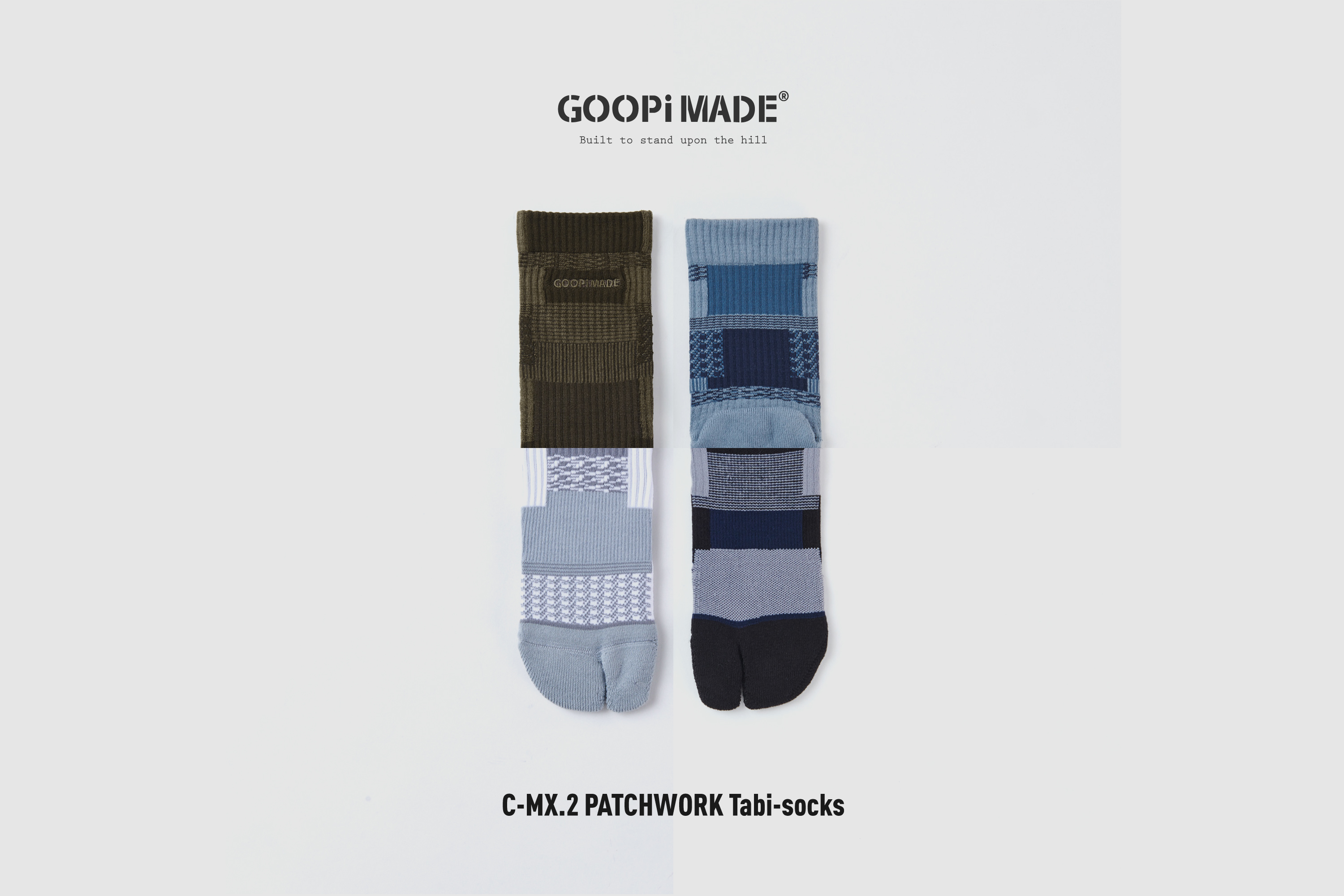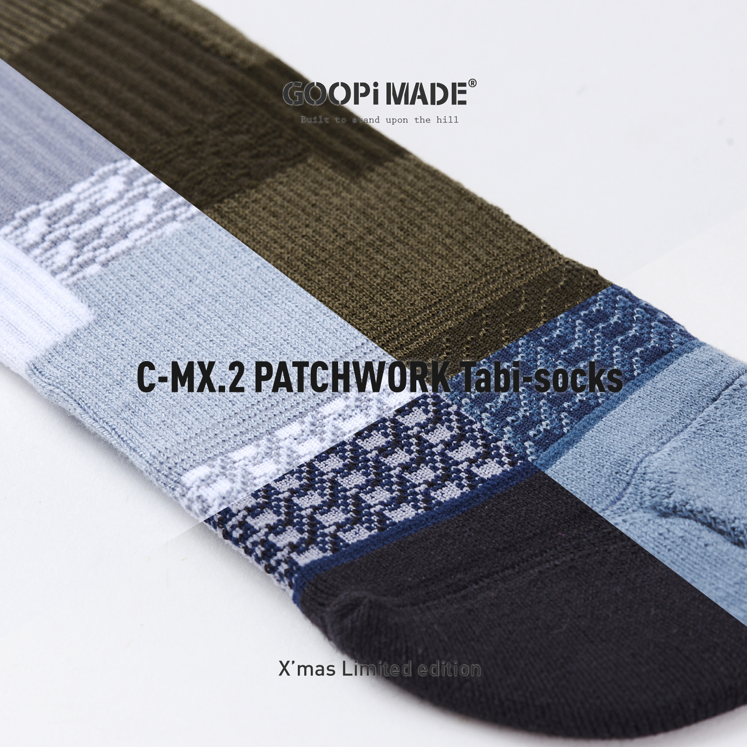 C-MX.2 Patchwork Tabi-socks 以藍染拼布為靈感,以多樣的拼布花紋打造,首先奠定 INDIGO 配色,接著以老式軍布拼接發想另外三色。