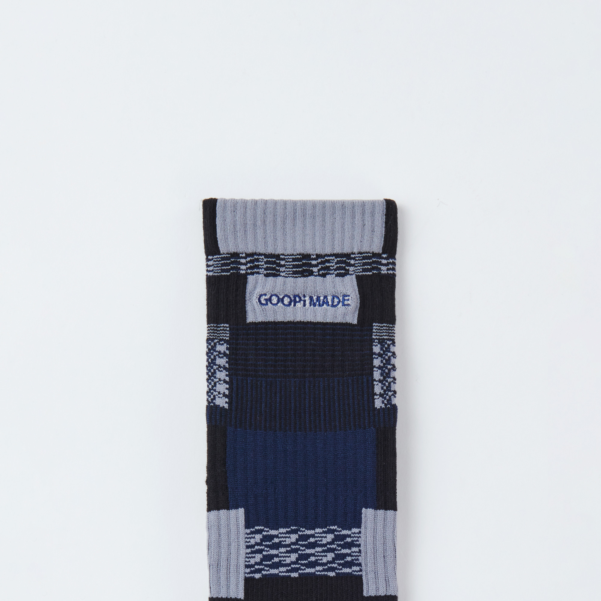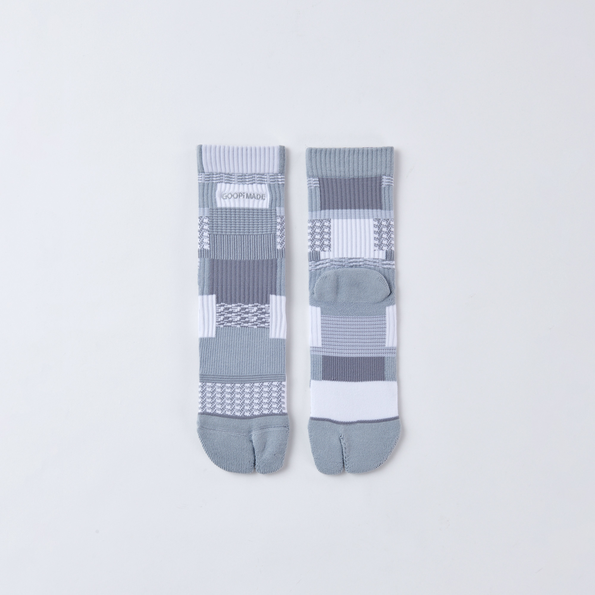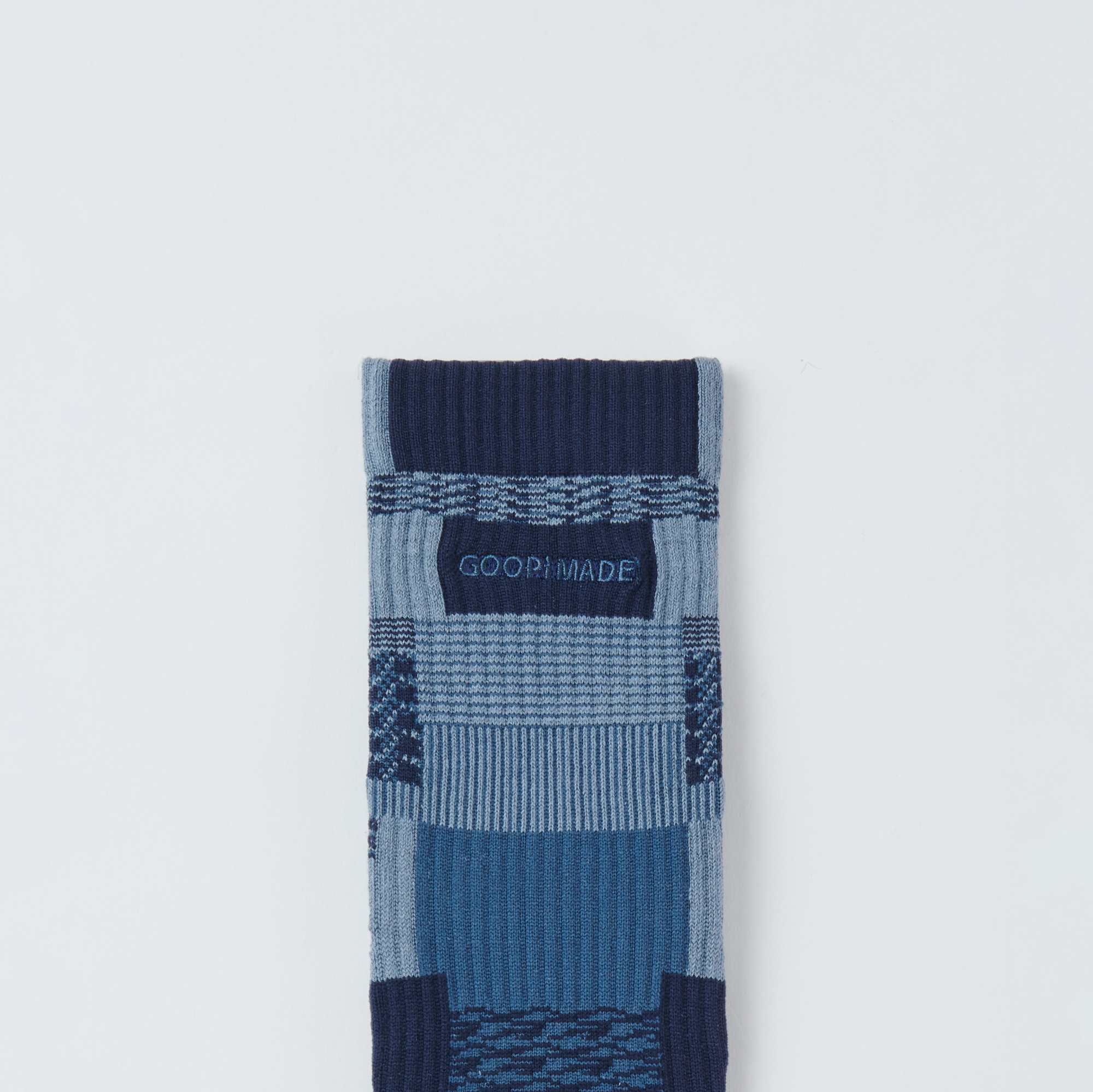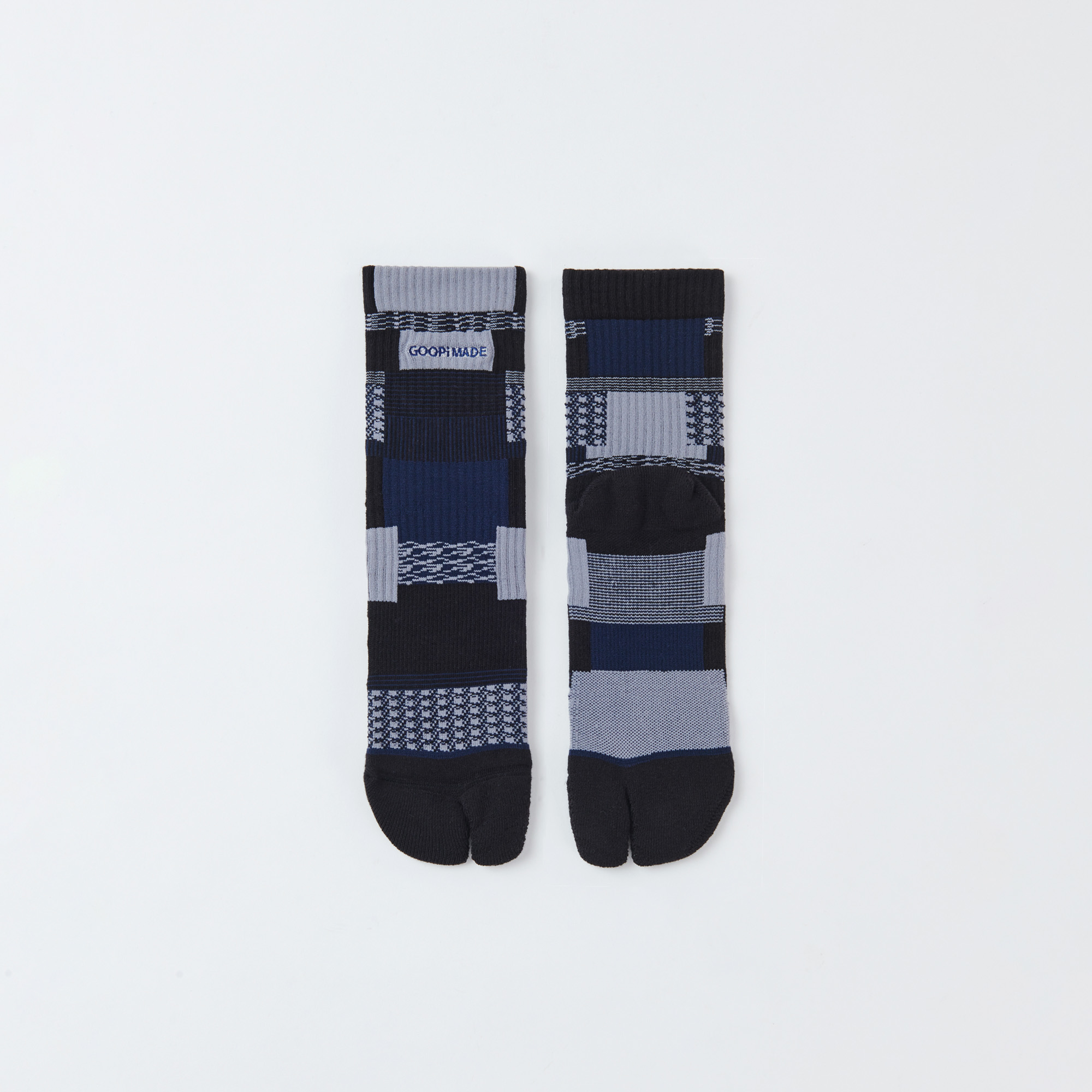 C-MX.2 Patchwork Tabi-socks 以藍染拼布為靈感,以多樣的拼布花紋打造,首先奠定 INDIGO 配色,接著以老式軍布拼接發想另外三色。